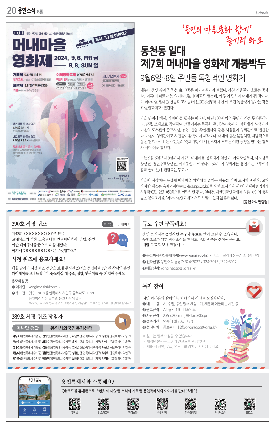 제7회 머내마을영화제는 기흥구의 백남준아트센터, 용인시미디어센터, 처인구의 뚝플레이스가 함께 하면서 ‘동천동을 거점으로 용인지역 전역’에서 영화가 상영되는 뜻 깊은 첫 해가 되었습
