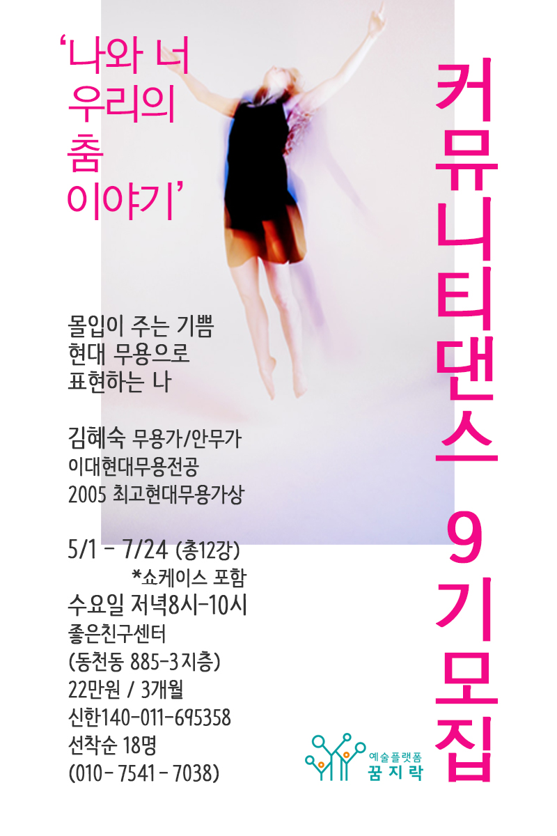 | 춤, 나로 피어나다 커뮤니티 댄스 강좌 수강생 모집 (0) | 2023.02.09 |