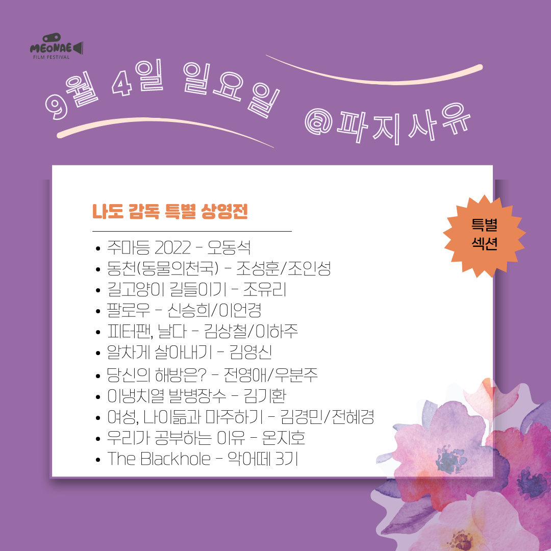 제5회 #머내마을영화제 홍보위원인 #주호민 작가와의 GV, 그리고 #우리들의블루스 영희역으로 깊은 감동을 선물한 #정은혜 배우와의 GV 등 9월 4일 폐막제 전체 상영작과 다양한 행사를 소개합니다.