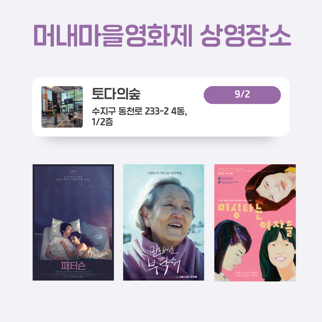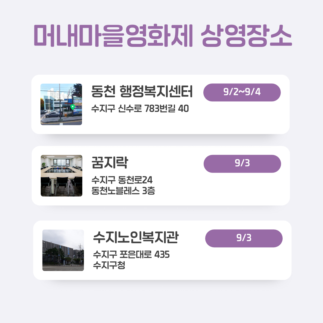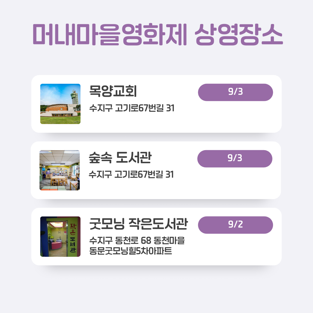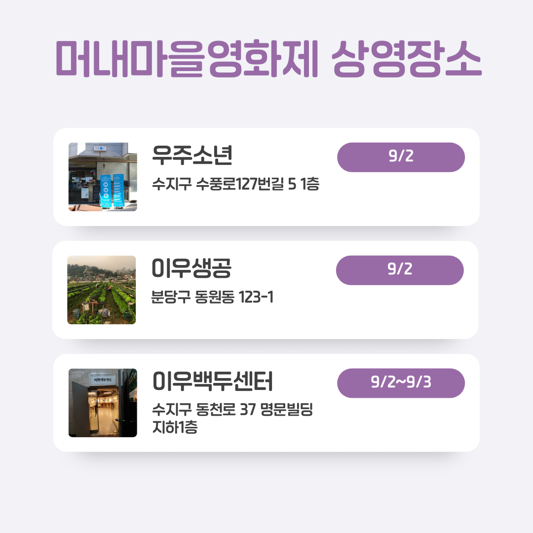 9월의 첫 주말 용인시 수지구 동천동, 고기동, 풍덕천동 일대에서 열리는 제5회 #머내영화제 상영장소 일단 저장하고 시작할까요? #머내마을 곳곳에서 가족, 인권, 전쟁, 성소수자 등 다양한 주제의 영화를 즐겨보세요.