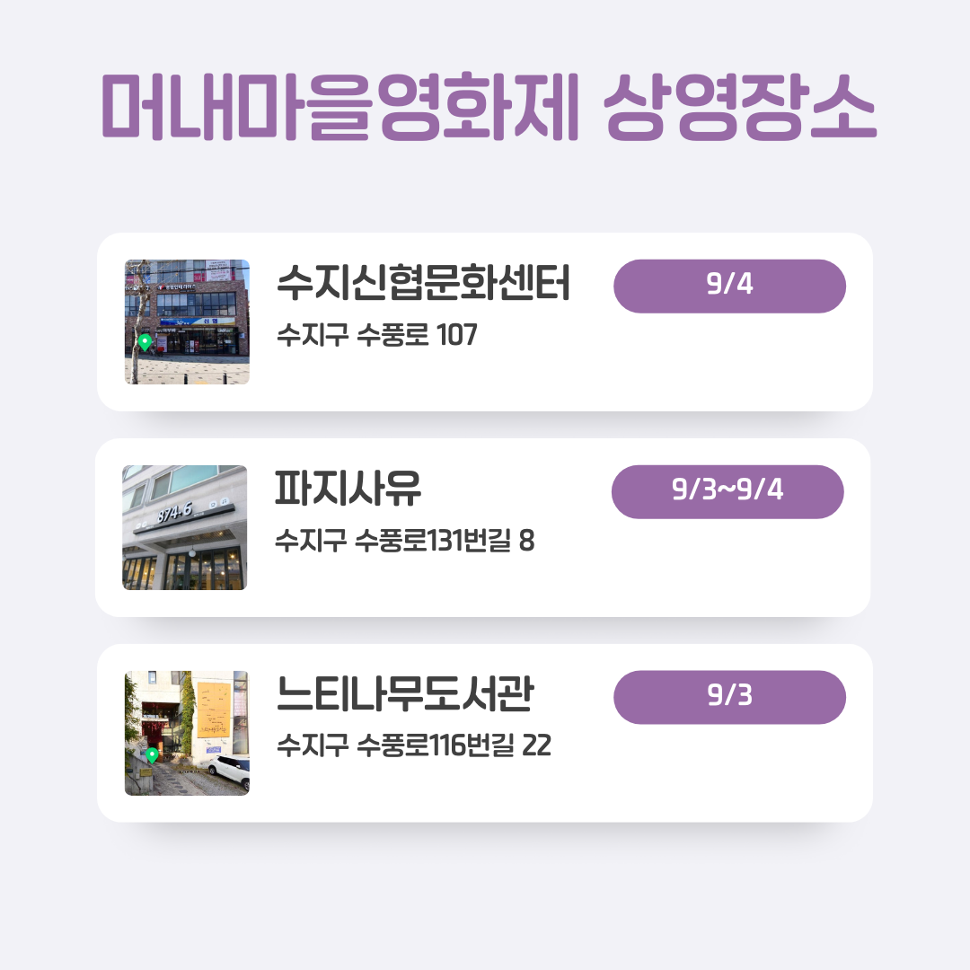 9월의 첫 주말 용인시 수지구 동천동, 고기동, 풍덕천동 일대에서 열리는 제5회 #머내영화제 상영장소 일단 저장하고 시작할까요? #머내마을 곳곳에서 가족, 인권, 전쟁, 성소수자 등 다양한 주제의 영화를 즐겨보세요.