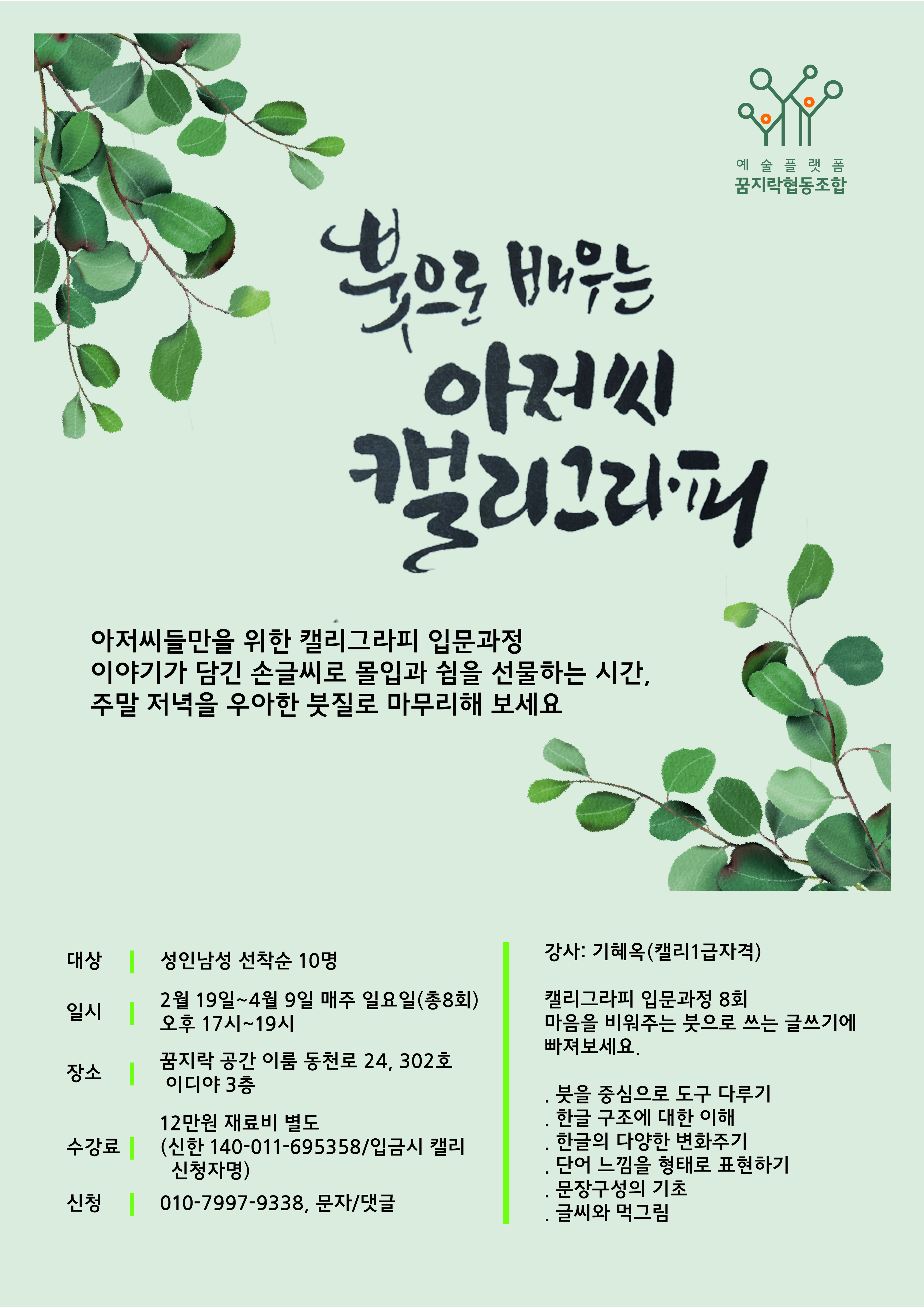 녹록치않은 삶의 무게에서 벗어나, 날렵한 붓에 마음울 실어봐요. 멋진 글씨 한 번 써보고 싶다고 생각만하셨던, 평일에 시간이 안되서 안타까우셨던, 옆집 아줌마들 사이가 부끄러우셨던